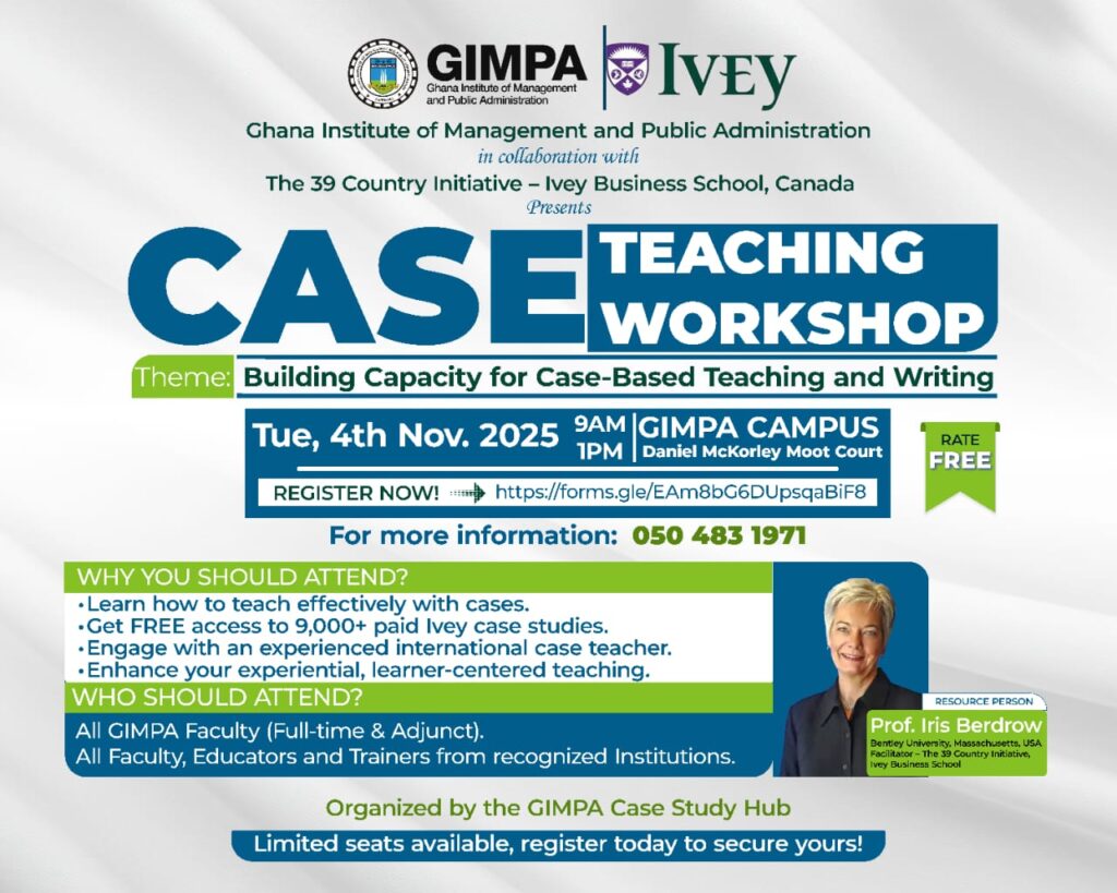 The Ghana Institute of Management and Public Administration (GIMPA), in collaboration with The 39 Country Initiative – Ivey Business School, Canada, will host a Case Teaching Workshop on Tuesday, 4th November 2025, from 9:00 a.m. to 1:00 p.m. at the Daniel McKorley Moot Court, GIMPA Campus. Themed “Building Capacity for Case-Based Teaching and Writing,” the […]
