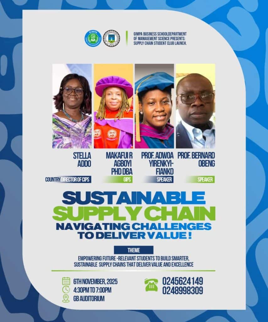 November 6, 2025 @ 4:30 pm – 6:00 pm – The world runs on supply chains, and the future needs innovative thinkers to make them smarter and more sustainable. That’s why the GIMPA Business School, Department of Management Science, is launching the GIMPA Supply Chain Management Students’ Club (GiSCOM) to help develop future-relevant students to navigate challenges and build smarter, sustainable supply chains that deliver […]