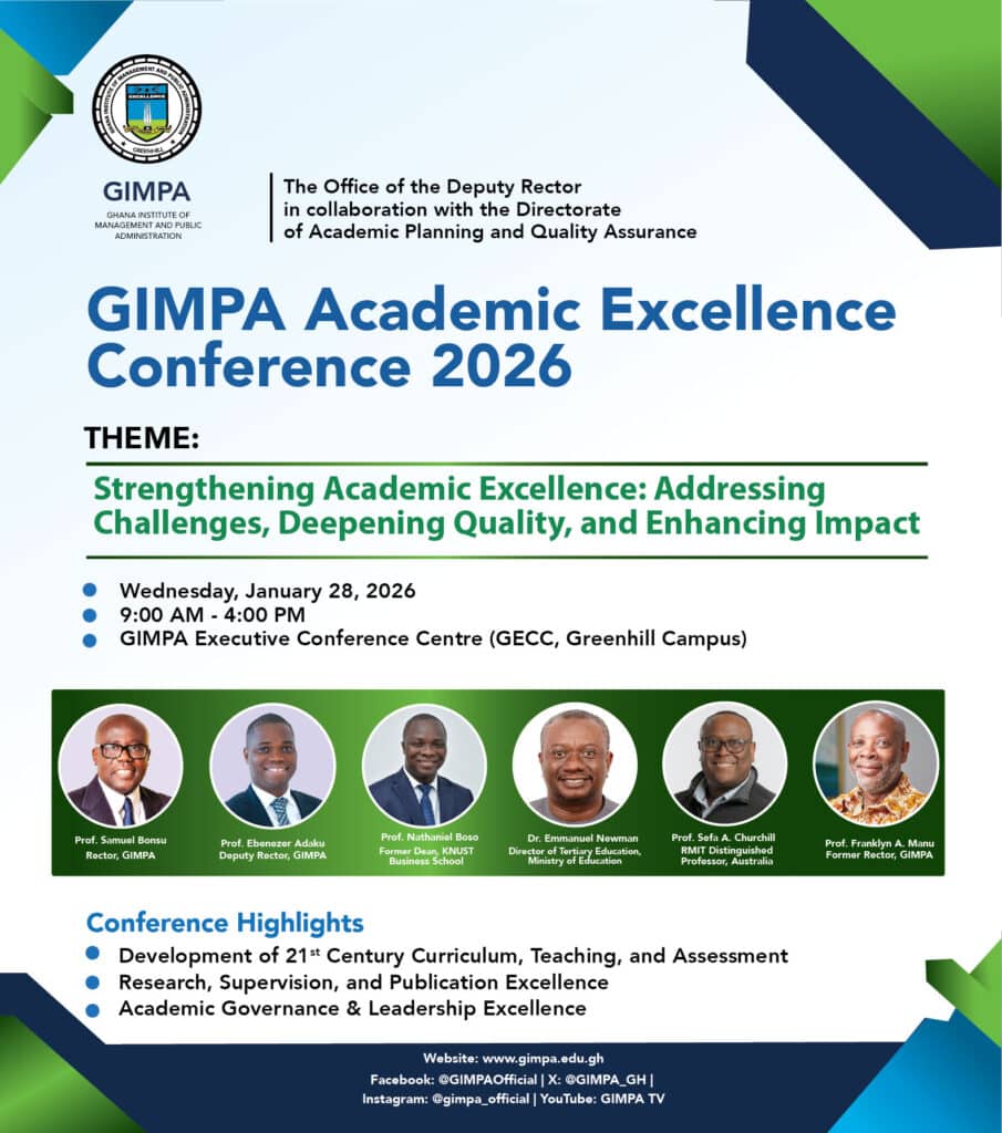 January 28, 2026 @ 9:00 am – 4:00 pm – GIMPA to Host a Maiden Academic Excellence Conference 2026 The Ghana Institute of Management and Public Administration (GIMPA) is set to host its highly anticipated Academic Excellence Conference 2026 on January 28, 2026, at the GIMPA Executive Conference Centre (GECC), Greenhill campus.This year’s theme, Strengthening Academic Excellence: Addressing Challenges, Deepening Quality, and Enhancing Impact reflects […]