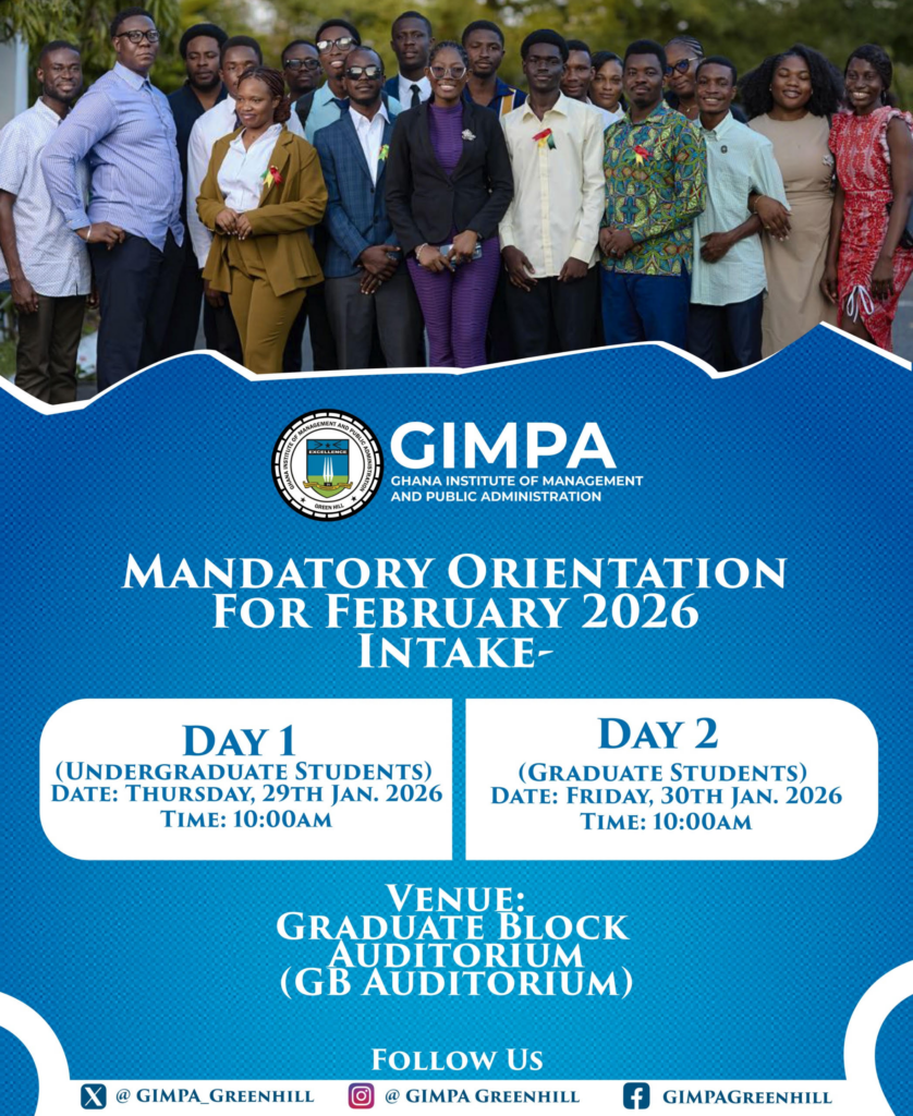 October 10, 2025 @ 4:00 pm – 6:00 pm – The Academic Affairs Directorate wishes to inform the entire GIMPA community that the Matriculation Ceremony for all students admitted into the various Undergraduate and Graduate programmes in September 2025 will be held as follows: NOTICE – OCTOBER 2025 MATRICULATION CEREMONY