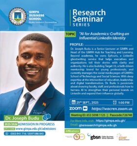 GIMPA Business School Hosts Seminar on AI for Academic Personal BrandingOn Thursday, 25th September 2025, the GIMPA Business School successfully hosted a research seminar on